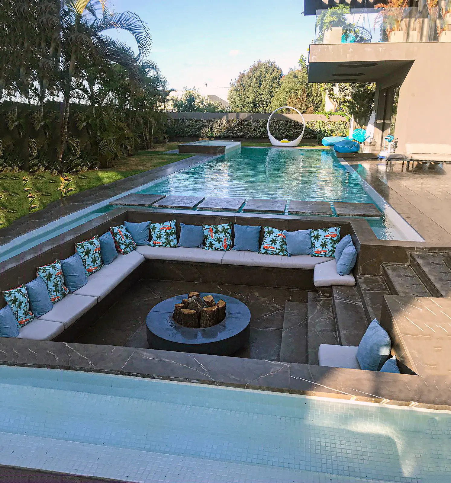 OUTDOOR – BBQ area with big dining table, 4 sun beds , the main and unique master piece of the house is the real fireplace area to sit with pillows and with real woods, tropical shower outside and stunning water fall from the roof to the swimming pool (25 X 7), hot tub inside the swimming pool.