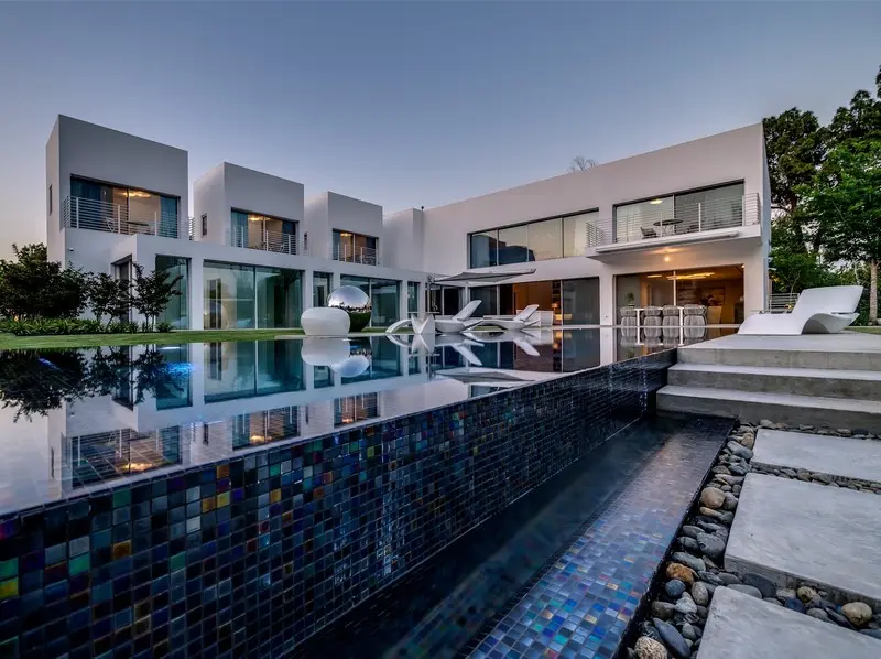 Joined by a single corridor, surrounded by water features, the rooms of the three older children: 17, 15, and 11 years old, are built in a row perpendicular to the main house, with space for individual life in the first floors and the bedrooms upstairs. Each room has its own terrace overlooking the garden, as well as a large balcony off the master bedroom on the main wing. The courtyard is carefully designed with contemporary design furniture that is integrated with the design of the residence, keeping it an essential part of living and comfortable space.