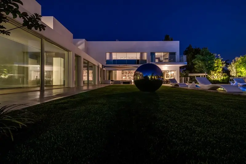 On the waterfront, the courtyard is dotted with ultramodern chairs and matching tables that display the same color as the house as a whole. Near the children's bedrooms, a large stainless steel sphere with mirror finish is an additional sculptural feature on the lawn. Every facet of outdoor space of the residence is designed to broaden the stylish and modern building outwards.